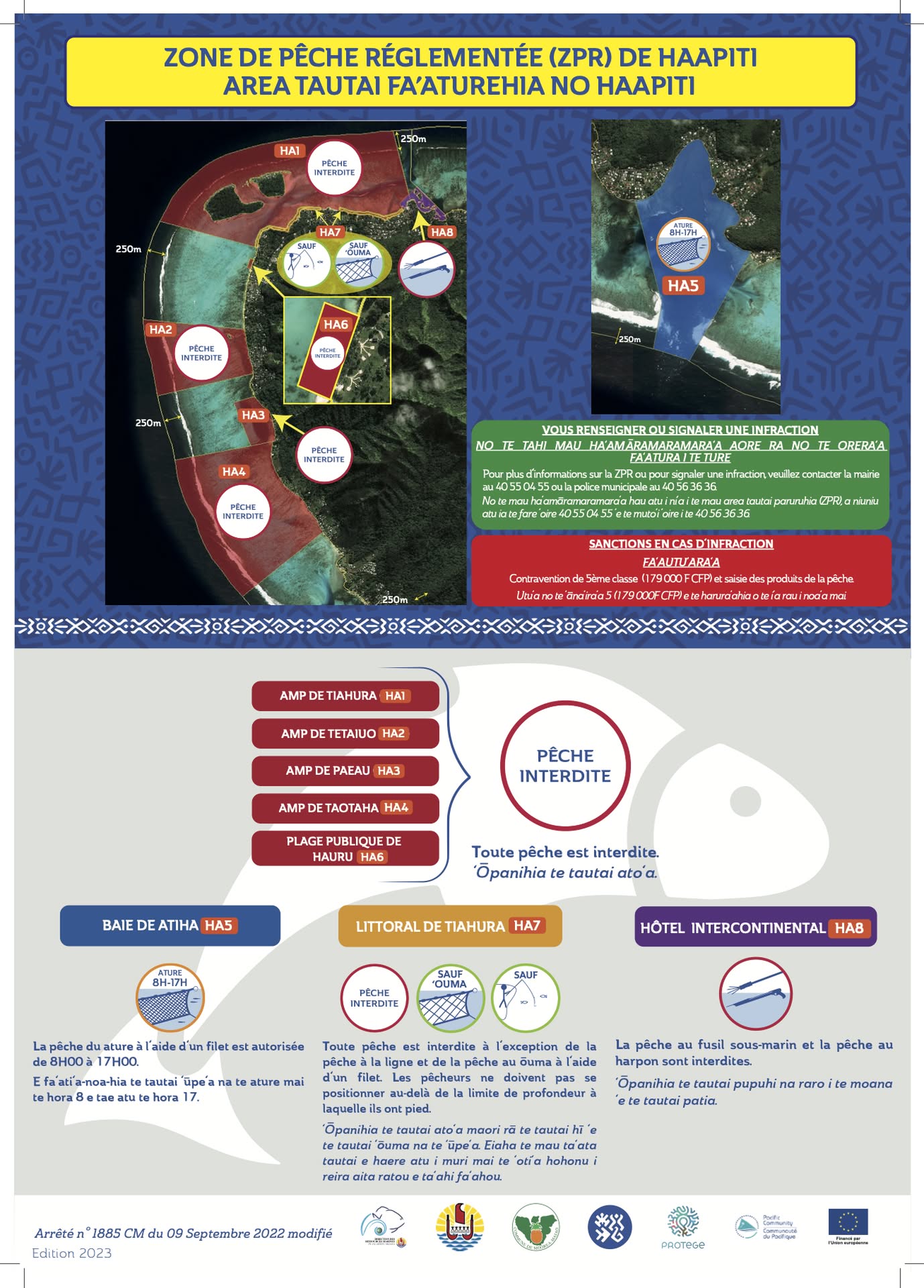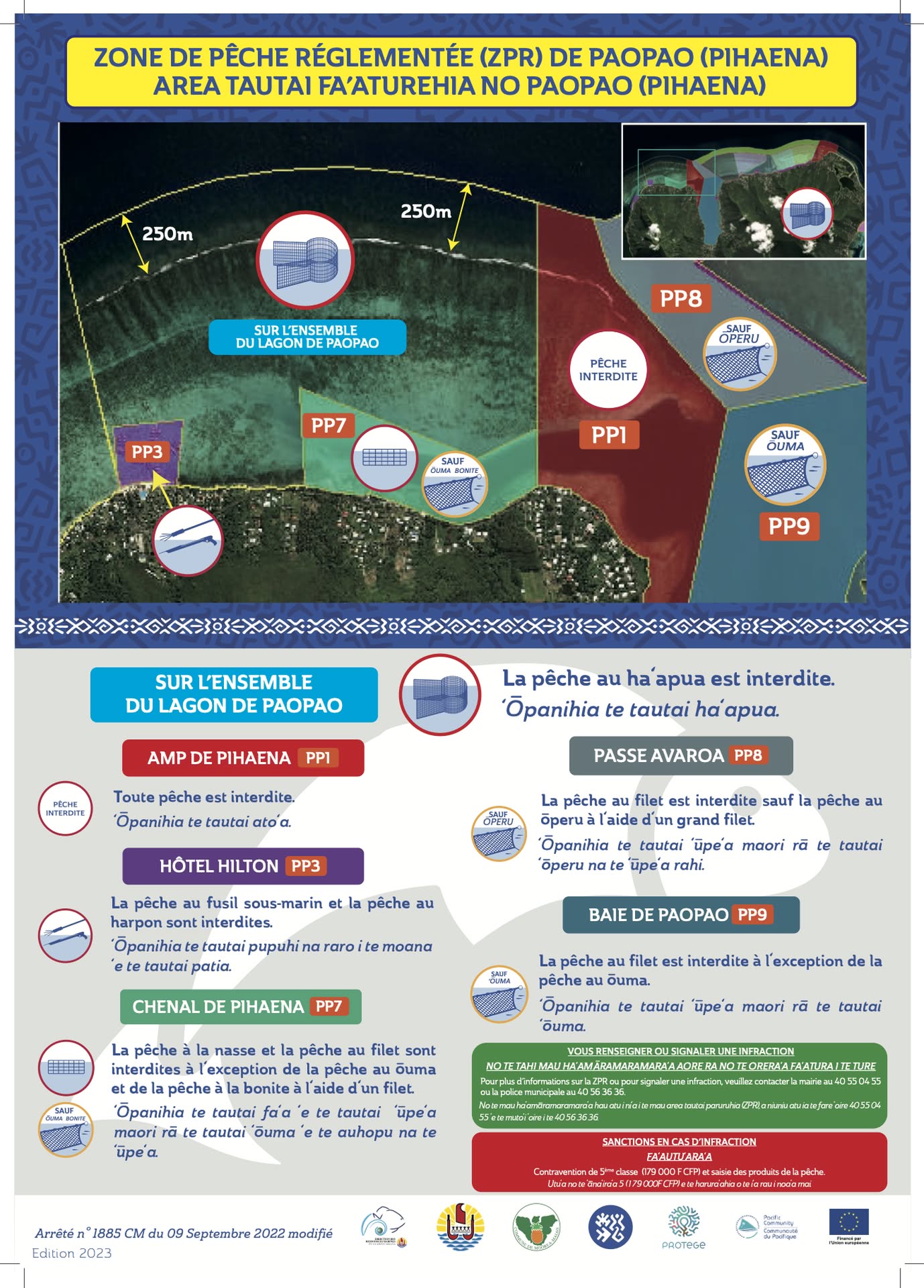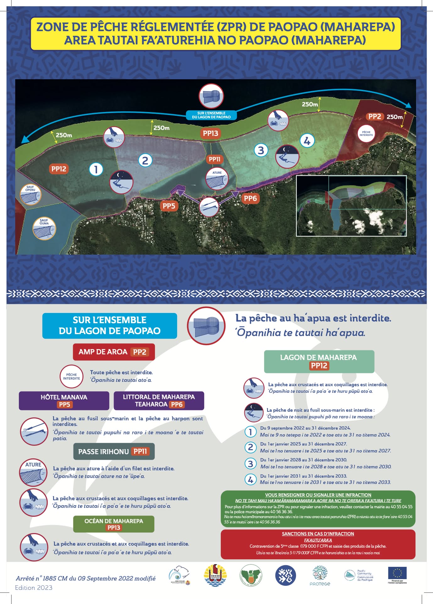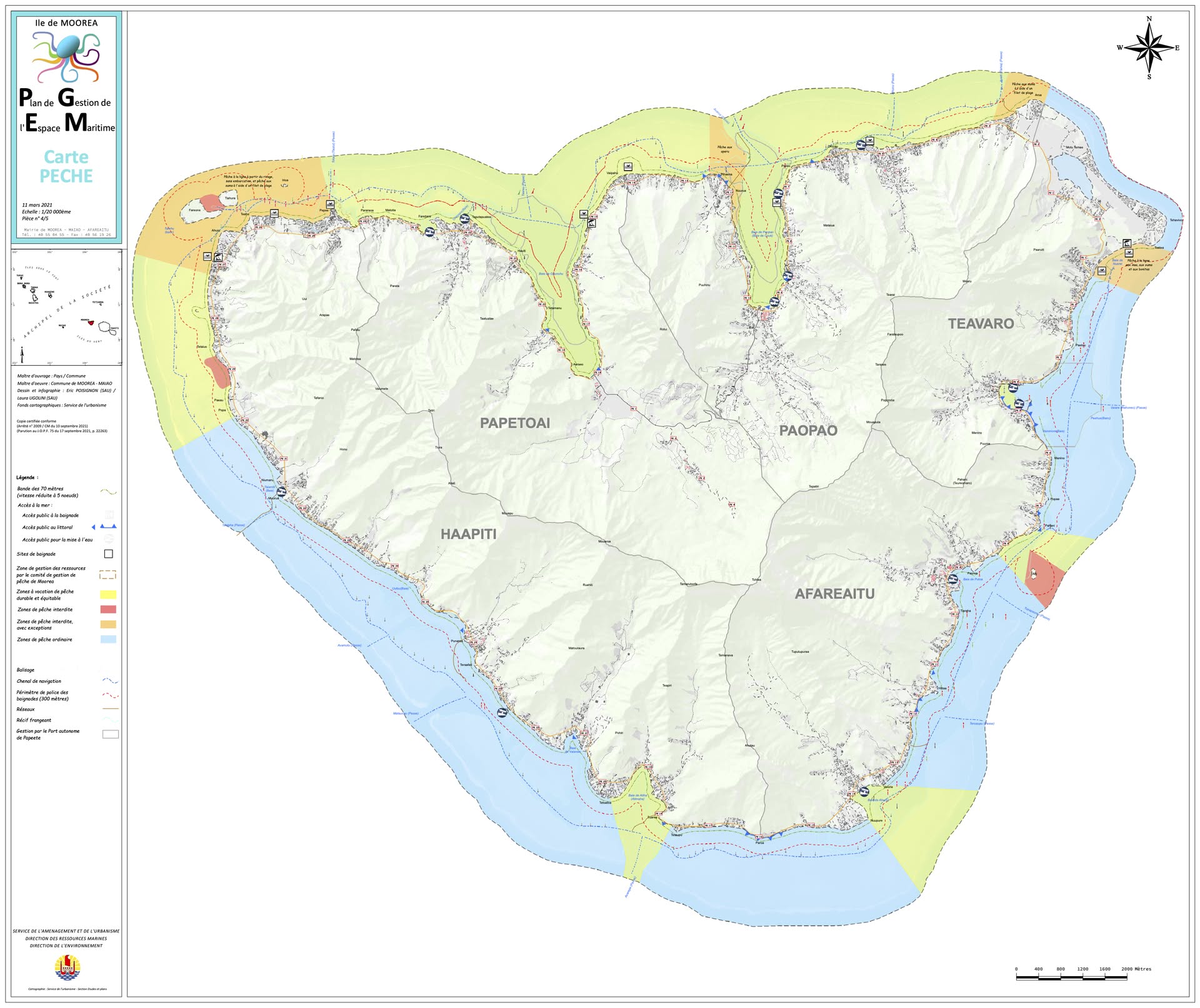 Pour la pêche sur Moorea, se référer à l’ arrêté n° 1885 CM du 9 septembre 2022 réglementant la pêche sur l’espace maritime au droit de la commune de Moorea-Maiao :
